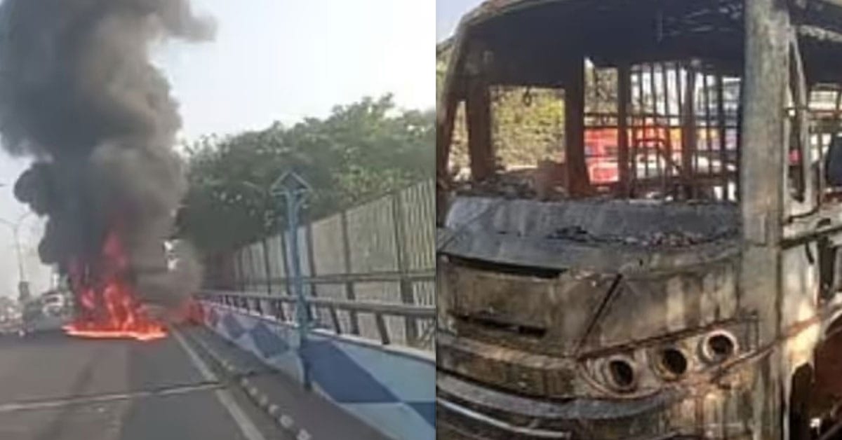 বুধবার সকালে বিদ্যাসাগর সেতুর ওপরে পুড়ে ছাই হয়ে গেল একটি বাস। অল্পের জন্য রক্ষা পেলেন যাত্রীরা। বাসটি হাওড়ার আমতা থেকে ধর্মতলার উদ্দেশ্যে যাচ্ছিল। দ্বিতীয় হুগলি সেতুর ওপর দিয়ে যাওয়ার সময় আচমকাই একটি জায়গা থেকে কালো ধোয়া বেরোতে দেখেন বাসের যাত্রীরা। আতঙ্কিত হয়ে তারা সঙ্গে সঙ্গে ড্রাইভারকে বাসটি থামাতে বলেন। ড্রাইভার বাস দাঁড় করালে যাত্রীরা দ্রুত বাস থেকে নেমে আসেন। নেমে আসেন ড্রাইভার কন্ডাকটারও। কিছুক্ষণের মধ্যেই গোটা বাসটিতে আগুন ধরে যায়। সময়মতো সবাই বাস থেকে নেমে পড়ায়, বড়সড় দুর্ঘটনার হাত থেকে রেহাই পাওয়া গিয়েছে।